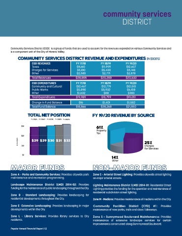 Community Services District (CSD):  Is a group of funds that are used to account for the revenues expended on various Community Services and