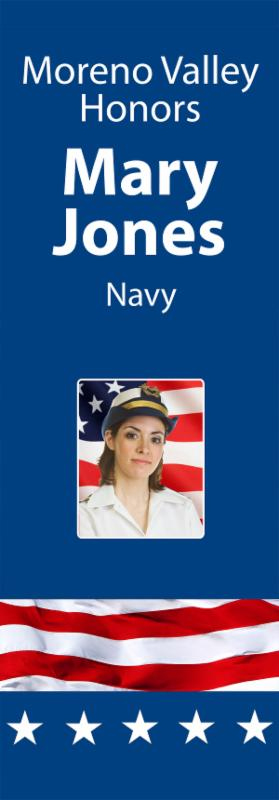 The Military Appreciation Banner program is partially sponsored by the Moreno Valley Chamber of Commerce’s Military Affairs Committee. As a result of the committee's generous support, applicants will be responsible for just a small portion of the cost of having a personalized banner created and installed on a City street light pole. The applicant's total cost is only $100.